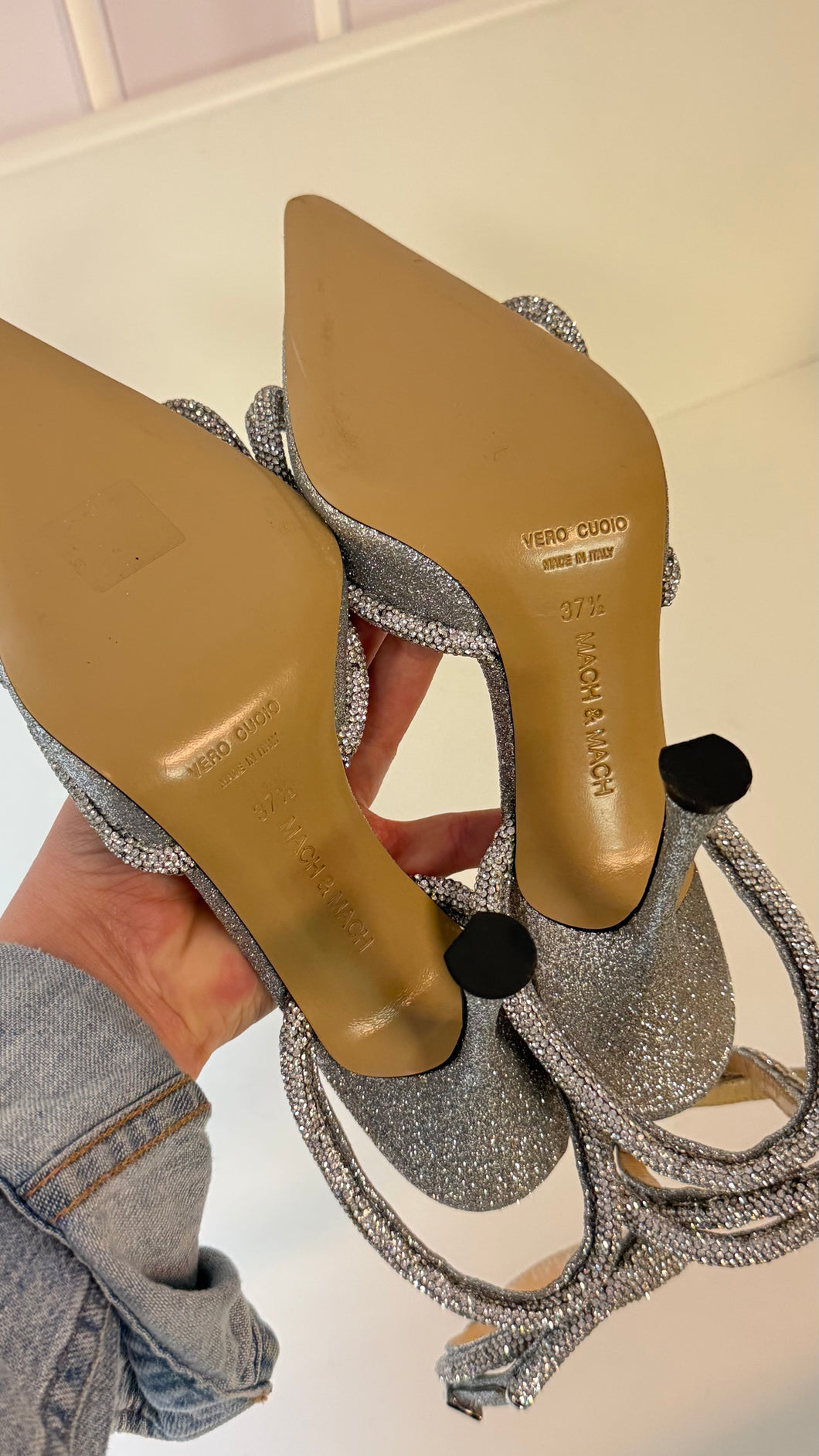Mach & Mach Shoes, Silver Double Bow Crystal-Embellished Satin Pumps (size 37.5)