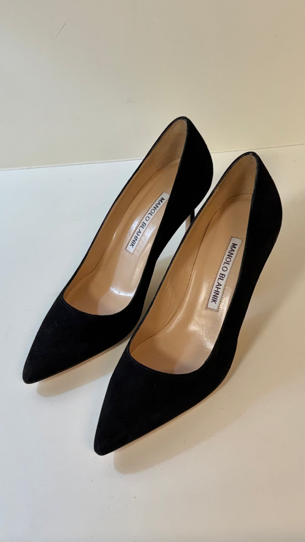 Manolo Blahnik Shoes, Black Suede Point Toe 70 Pumps (size 35)